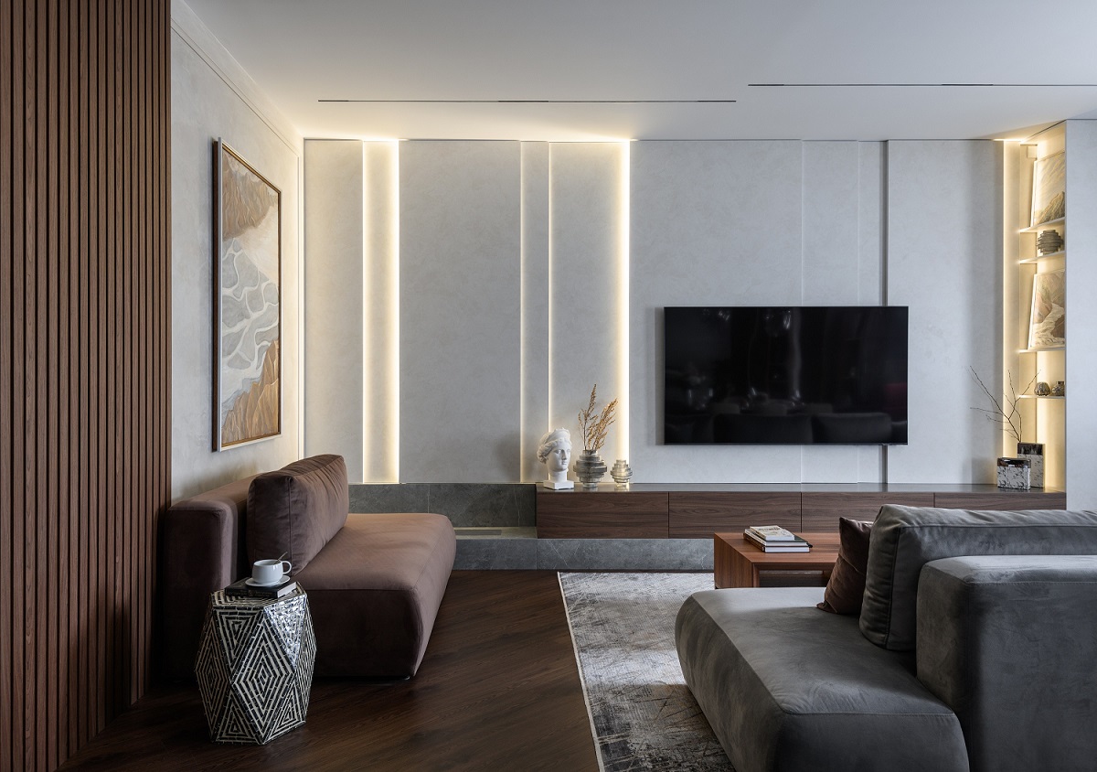 Нейтральные оттенки балансируются целым набором из текстур: ёлочка под дерево, камень, чёрное стекло, деревянные фасады, матовые ткани рисуют объем этой картины.